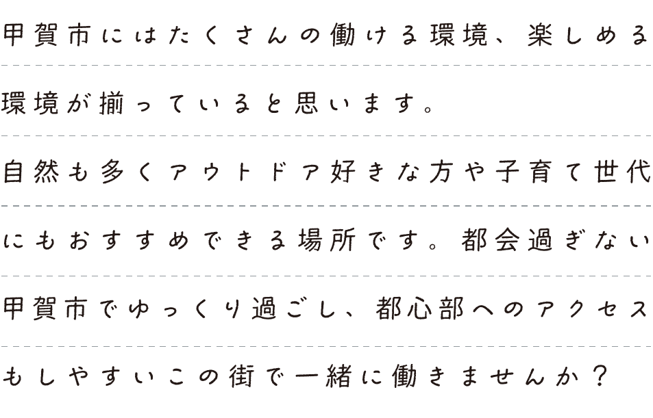 就職を機に甲賀市で過ごすことも増えましたが、守山市在住のため甲賀市の素晴らしさについてまだまだ知らない事もあります。甲賀市の印象としては、昔ながらの街並みも残したつつ、たくさんの飲食店や物販店があることから、老若男女問わず楽しく生活出来る場所だと思います。また代表的な施設といえば「水口スポーツの森」があります。高校時代は陸上競技をしていたこともあり、よく「スポーツの森」で練習をしたり、大会に参加することも多かったので思い出のある場所です。また趣味でキャンプをすることが多いので自然が多い甲賀市にはキャンプ場も多くあるのも好きなところのひとつです!