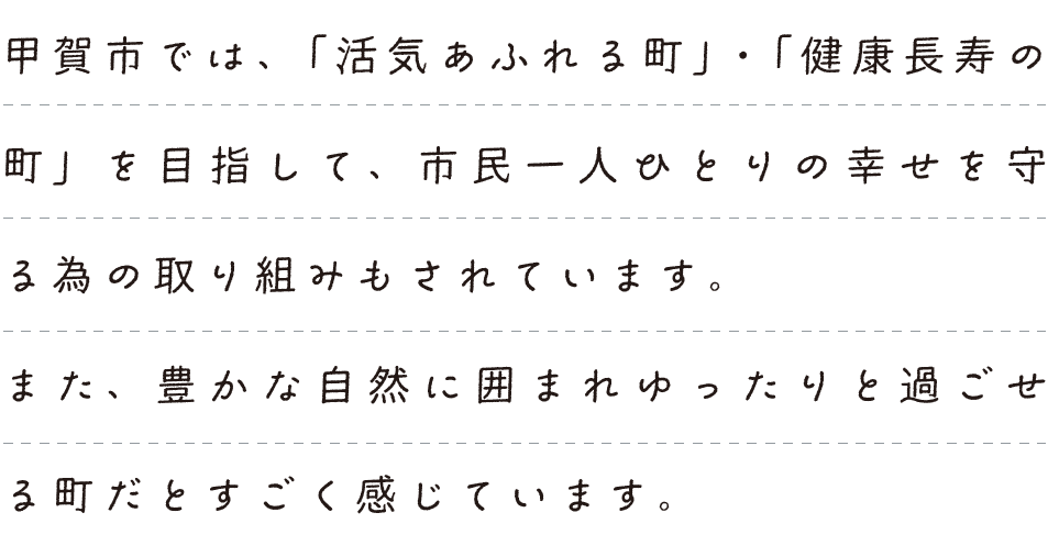甲賀市には、水口宿や土山宿など、昔ながらの街並みや歴史的な建物が今も残っていて、とても素敵なんです。市の約7割が森林に覆われていて、春には桜、秋には紅葉と、四季折々の美しい自然を楽しめるところも大好きです。