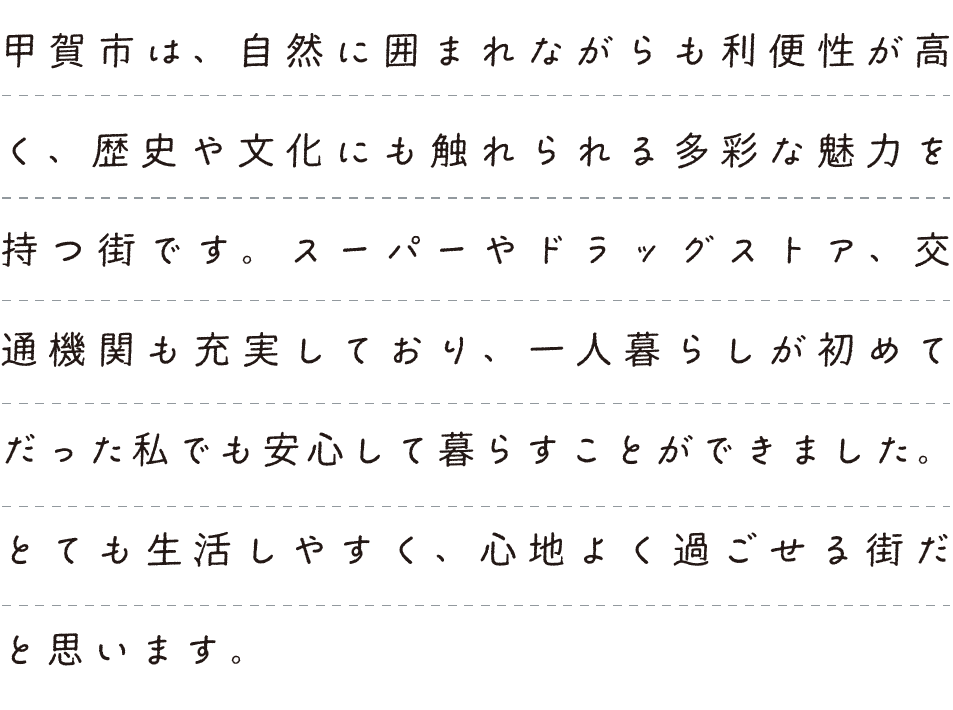 甲賀市は、国道1号線が通っているため、車移動が多い私にとって県内外への移動が非常に便利です。さらに、大型ショッピングモールが点在しており、日常の買い物から休日のショッピングまで快適に楽しめます。街にはレトロな雰囲気の喫茶店も多く、落ち着いた空間でゆったりとした時間を過ごすことができ、心身ともにリフレッシュできます。また、水口スポーツの森には野球場やテニスコート、キャンプ場などが整備されており、自然の中で体を動かすことができるのも魅力の一つです。生活の利便性と癒し、そしてアクティブな時間がバランスよく共存する点が、甲賀市の好きなところです。
