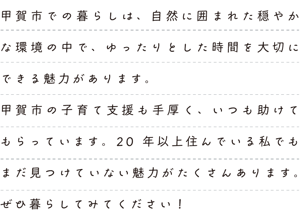 甲賀市は自然と歴史が調和した静かな雰囲気のある街です。豊かな山々と清らかな川に囲まれ、四季折々の風景が楽しめます。特に春の桜や秋の紅葉は美しく、訪れる人の心を癒してくれます。また、「甲賀忍者」の里としても知られ、忍者にまつわる歴史や文化を体験できる施設が多く、子どもから大人まで楽しめます。静かな環境の中で、自然と触れ合いながら歴史ある街並みを歩く時間はとても贅沢です。静かでのんびりとした暮らしの中に、深い歴史が息づく甲賀市は、とても魅力的な場所です。